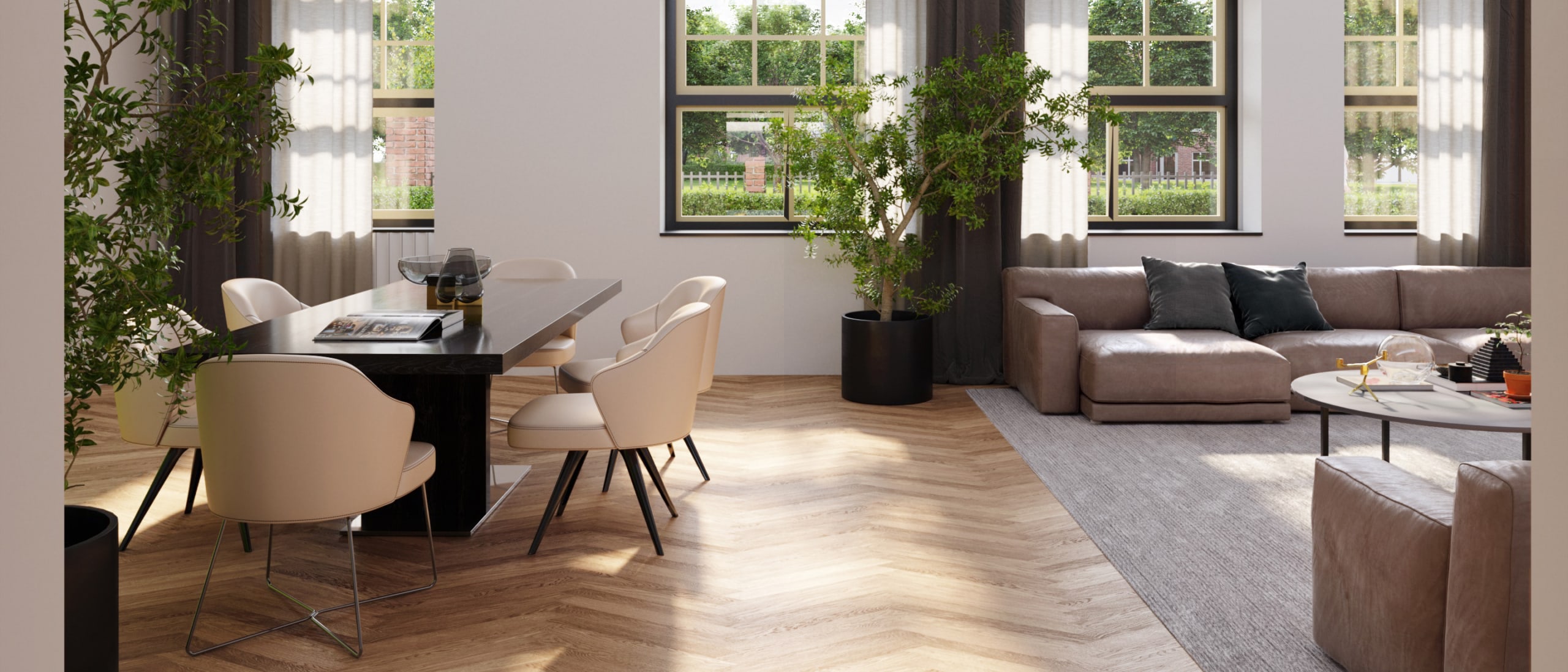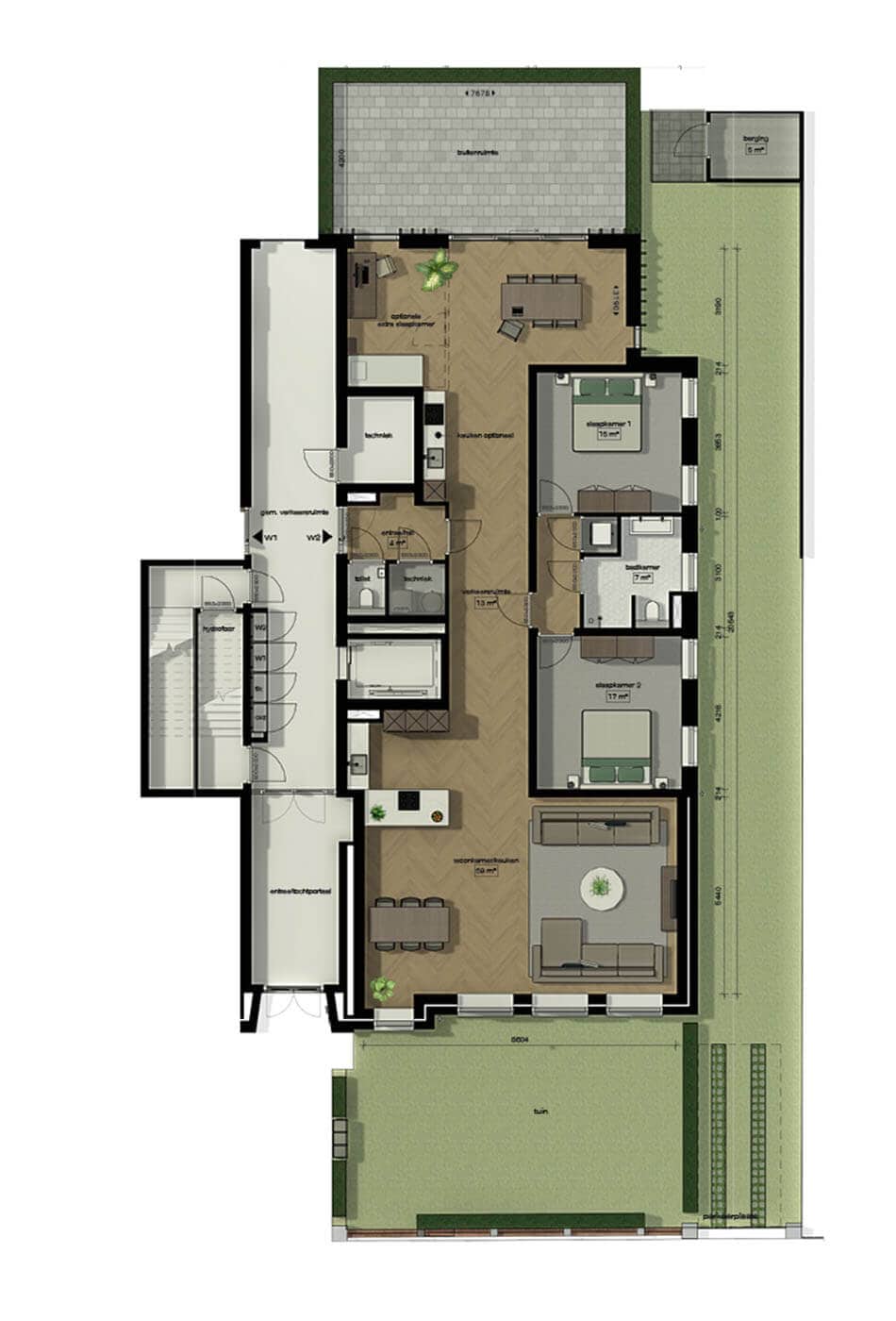 Dit riante appartement bevindt zich op de begane grond en heeft over de volledige diepte een eigen tuin. Vanuit je tuin loop je zo naar je berging aan de achterkant van het complex. De woonkamer heeft een extra hoog plafond en is straks aan de voorzijde gesitueerd. Dat is een bewuste keuze want zo haal je de sfeer van het plein zo je woning binnen.