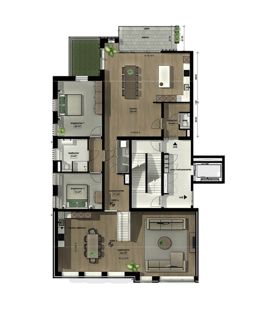 Een woonkamer met een verdiepte voorkamer, waardoor deze extra hoog is én waarmee je via de grote raampartijen de sfeer van het plein naar binnen brengt. Bovendien heeft dit riante appartment van maar liefst 184 m2 op de 2e verdieping ook nog een riant balkon aan de achterzijde.
