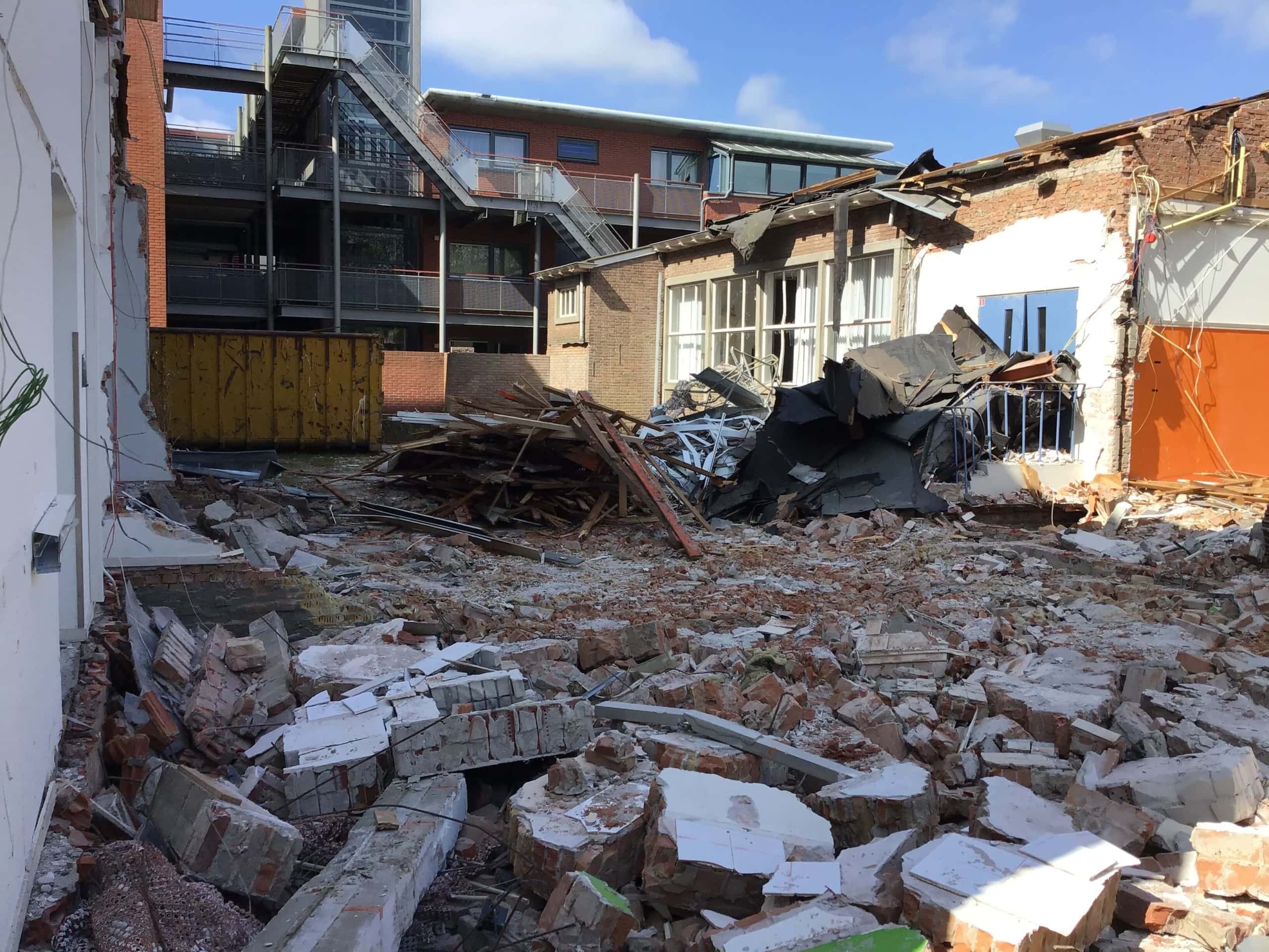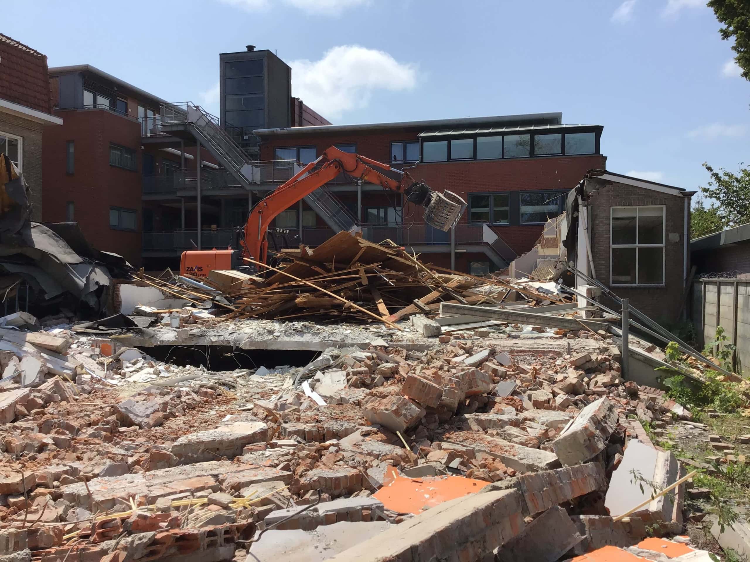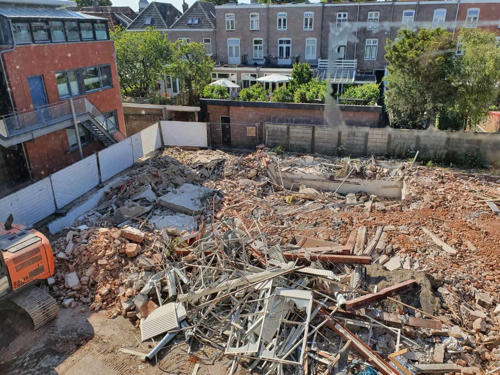 Daar waar aan het begin van de week nog een deel van het achterste pand stond, is deze inmiddels in zijn geheel gesloopt en is de achterzijde netjes afgezet. De volgende stap is het gefaseerd slopen van het originele pand. Dit zal in delen langzaam afgepeld worden omdat de voorgevel behouden blijft.